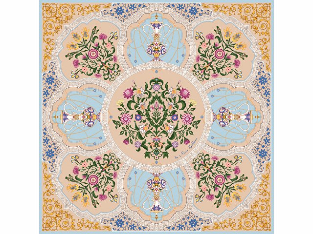 Принт аксессуара образуют знаменитые орнаменты востока — гирих (бесконечный “узел”) и ислими (“путь в божественный сад”). Непрерывные витиеватые линии в сочетании с узорами из гибких стеблей с зеленой листвой и пестрыми соцветиями завораживают, погружают в состояние медитации, постижения тайны мироздания через призму счастья и красоты.