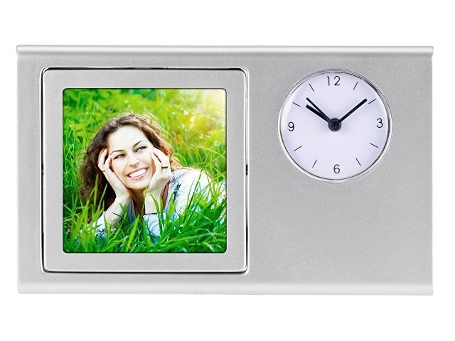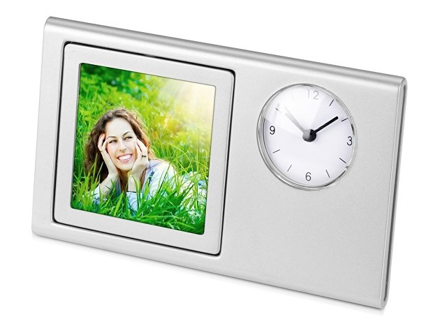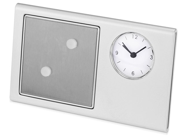 Настольные часы снабжены фоторамкой 6х6 см и магнитной доской на обороте, благодаря которой часы можно крепить к любой вертикальной металлической поверхности. Магнитную область можно также использовать в качестве держателя для канцелярских скрепок. Корпус часов имеет большую площадь для нанесения изображения.