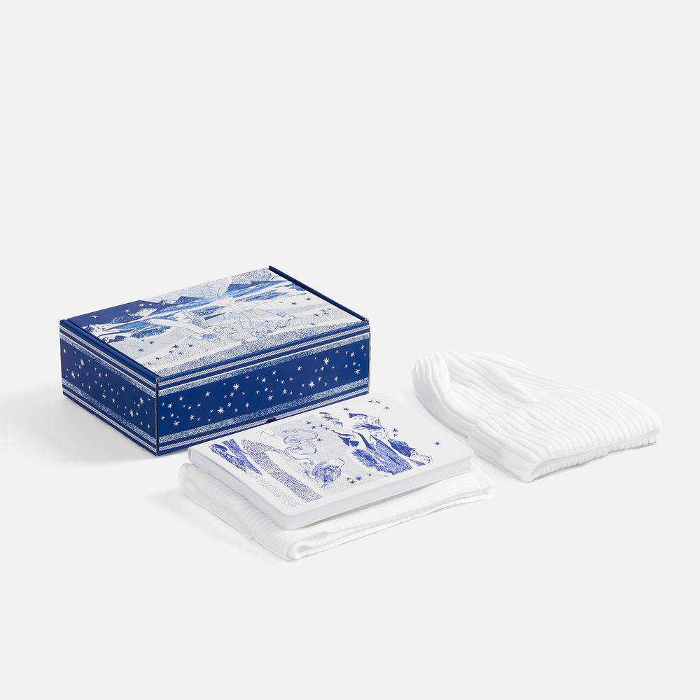 Подарочная упаковка и блокнот украшены чарующим детализированным изображением с совами на фоне бескрайнего горного пейзажа. Мудрые птицы несут на лентах важные послания с заветами на будущий год, а тончайшие линии выверенного рисунка создают неповторимое полотно северной сказки. Оттеняют магию Севера белоснежные шапка и шарф, которые подарят ощущение чистого зимнего утра и непередаваемого комфорта.