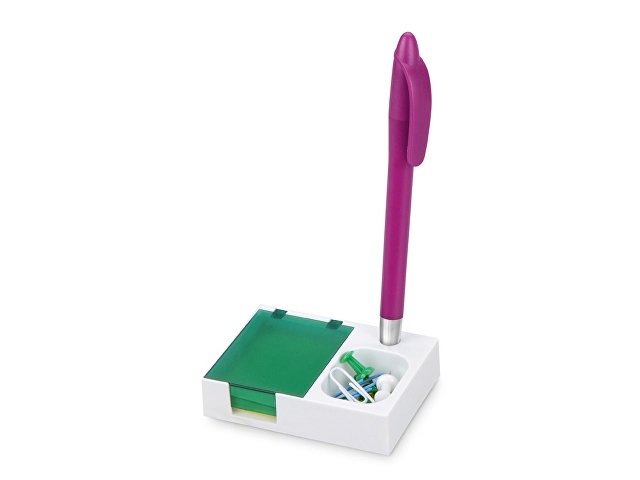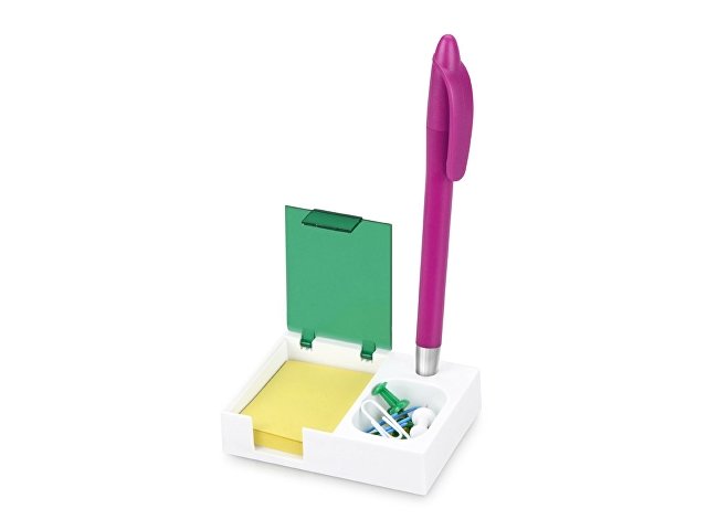 Яркая и удобная поставка под ручку, канцелярские скрепки и бумажный блок (4 х 5 см) превосходно организует ваше рабочее место. Отличный подарок при проведении промо-акций.