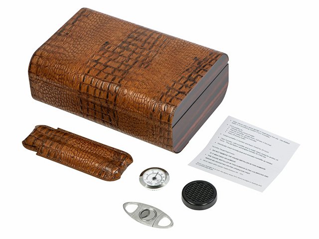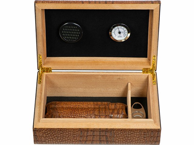 Прекрасный подарок для ценителей сигар. Хьюмидор в комплекте с аксессуарами для хранения и курения сигар придется по вкусу успешным бизнесменам. В комплект входят хьюмидор, футляр и нож для сигар, гигрометр и увлажнитель.