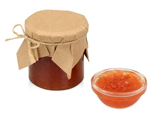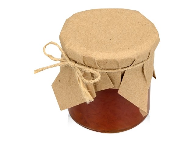 Банка варенья обернута крафт-бумагой, на которую возможно сделать нанесение корпоративного логотипа.